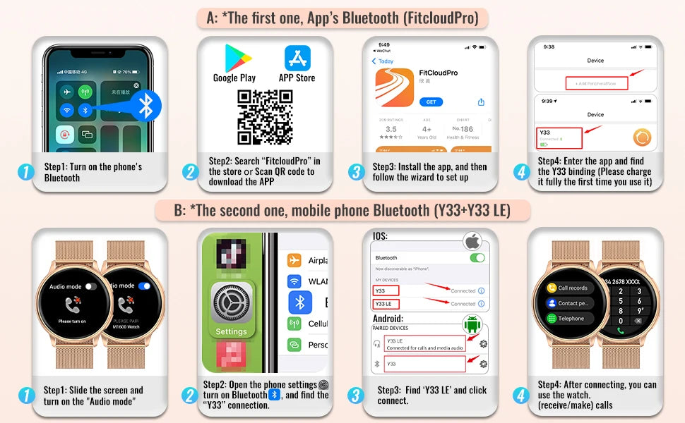 Instructions: Charge the smartwatch fully upon receipt. For setup, scan the QR code in the manual to download the FitCloudPro app and pair your device.