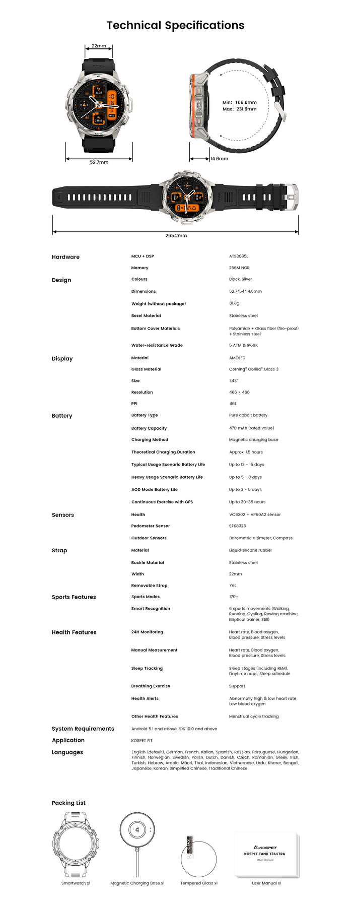 • Additional Features: Voice Assistant, Remote Camera Control, Music Control, Alarm Clock, Stopwatch, Weather, Flashlight, SOS
