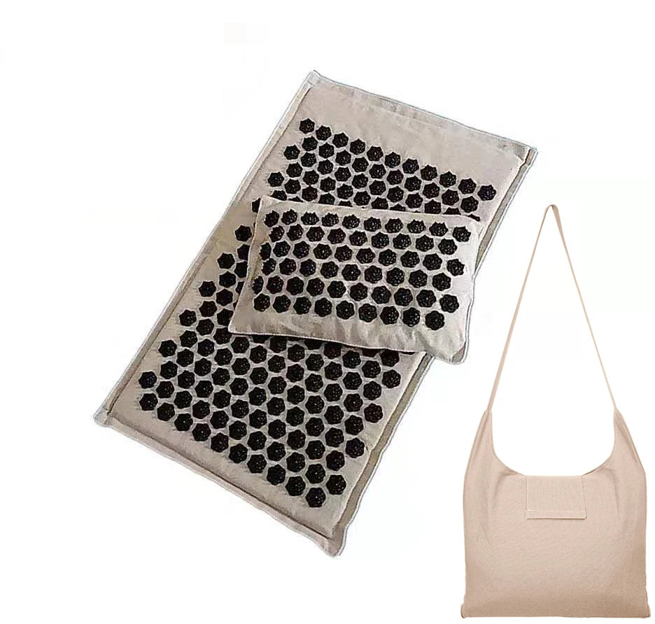 Featuring a cushion and pillow made from eco-friendly materials like cotton, hemp, and buckwheat husk, it provides a natural acupressure experience.
